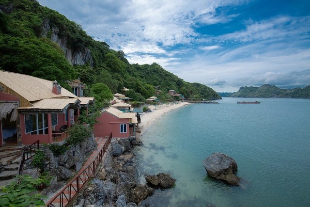 Because the island remains largely off mainstream travel routes, the beaches are clean and quiet, and the water is remarkably clear. The landscape combines soft white sand, emerald-colored sea, and towering limestone formations — a signature view of northern Vietnam’s coastline.