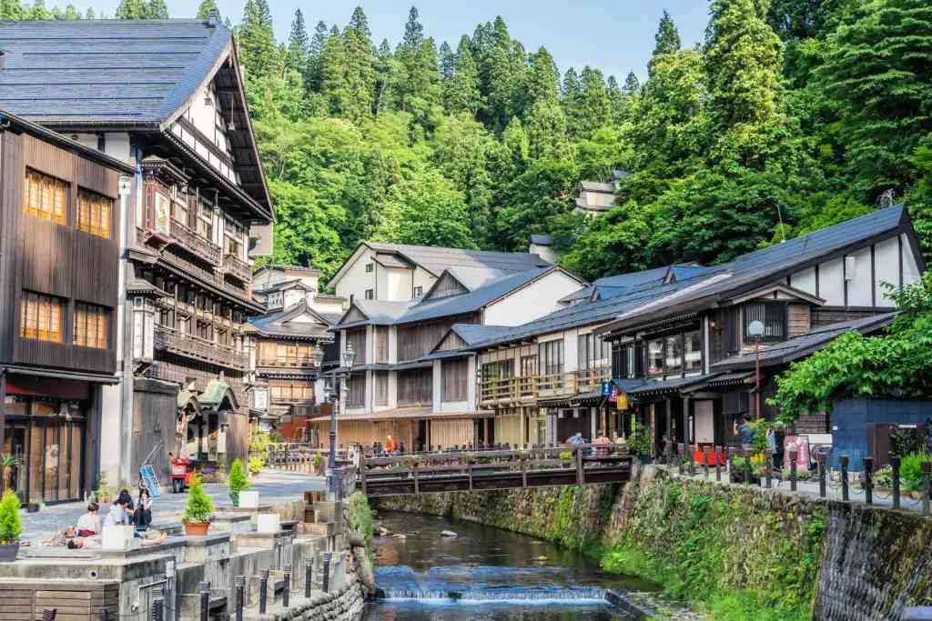 Ginzan Onsen là thị trấn suối nước nóng cổ nổi tiếng với các nhà trọ gỗ truyền thống nằm dọc theo con suối nhỏ. Vào mùa đông, mái nhà phủ tuyết và ánh đèn vàng tạo nên khung cảnh hoài cổ, lãng mạn như trong truyện cổ tích, gợi nhớ đến không khí thời Taisho của Nhật Bản.